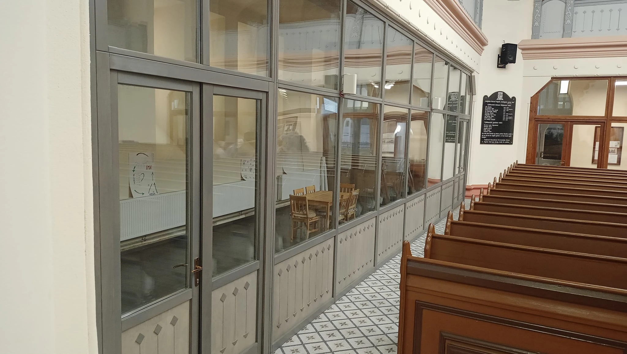 Kiemelkedő munkáink egyike a debreceni Árpád téri református templomban valósult meg, ahol liturgiás foglalkoztató kialakításához készítettünk egyedi, nagyméretű üvegfalakat.